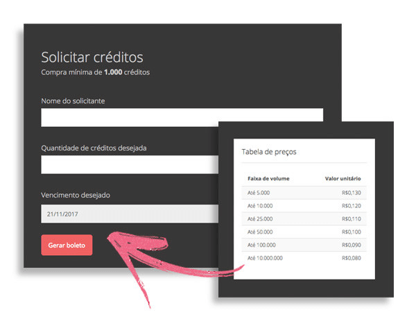 2º – Preencha o formulário com seu nome, a quantidade desejada (lembrando sempre que a compra miníma é 1000 SMS), data de vencimento e aí sim clique em GERAR BOLETO