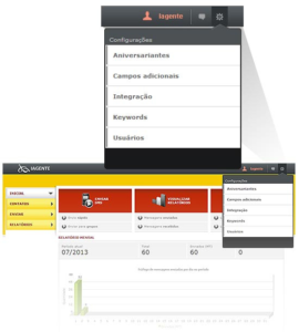 No final da barra existe o ícone de configuração que dá acesso as áreas do sistema onde você gerencia recursos como SMS de aniversário, criação de campos adicionais no cadastro de contatos, documentação de integração, listagem de keywords e criação de usuários com permissões.