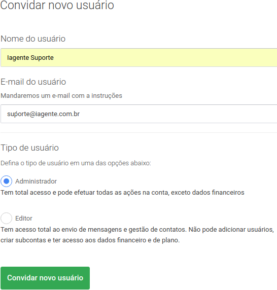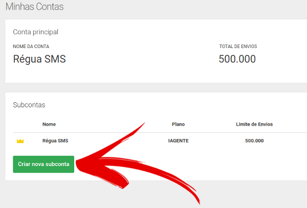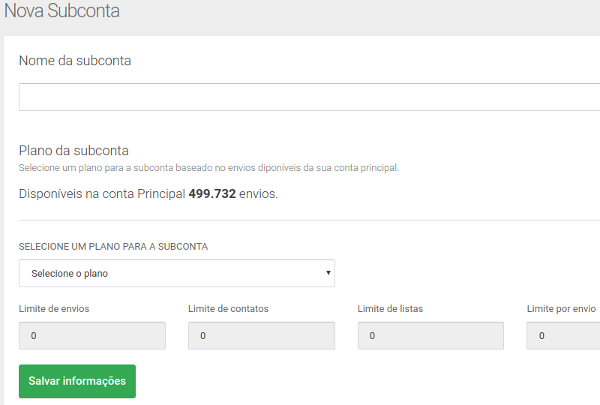 Como o próprio nome diz, o sistema de Multi-contas permite que você crie Sub-contas de acordo com sua necessidade. Geralmente, é utilizado por agências para atender a demanda dos clientes e facilitar a separação das contas. Neste caso, cada cliente da agência, por exemplo, tem uma conta específica para realizar seus envios e acessar facilmente seus relatórios de forma individual. Para já criar uma nova Sub-conta, basta criar um usuário (nome de um cliente ou departamento), definir a quantidade de envios desejado e o próprio sistema se encarrega de colocar os limites de envios / importação / etc. (previsto em contrato para a conta principal). Pontos importantes: 1º) Não é possível selecionar um plano para a Sub-conta maior do que o plano da conta principal