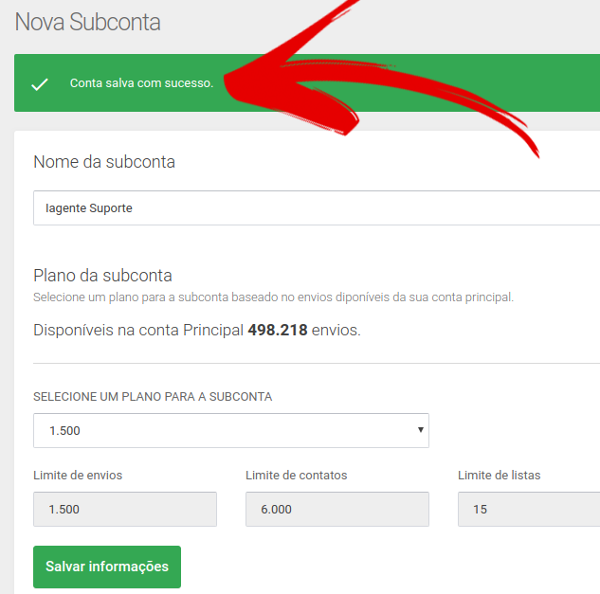 Como o próprio nome diz, o sistema de Multi-contas permite que você crie Sub-contas de acordo com sua necessidade. Geralmente, é utilizado por agências para atender a demanda dos clientes e facilitar a separação das contas. Neste caso, cada cliente da agência, por exemplo, tem uma conta específica para realizar seus envios e acessar facilmente seus relatórios de forma individual. Para já criar uma nova Sub-conta, basta criar um usuário (nome de um cliente ou departamento), definir a quantidade de envios desejado e o próprio sistema se encarrega de colocar os limites de envios / importação / etc. (previsto em contrato para a conta principal). Pontos importantes: 1º) Não é possível selecionar um plano para a Sub-conta maior do que o plano da conta principal